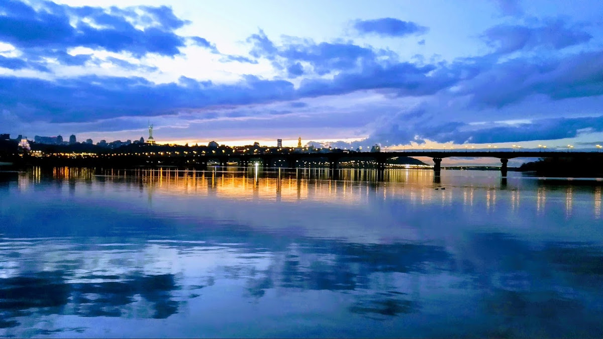 Прекрасна вечірня панорама моста Патона при включених ліхтарях на тлі освітленної прожекторами статуї Батьківщини-матері.