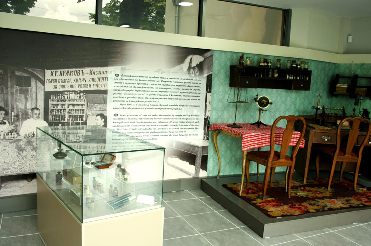 Експозиція музею включає в себе оригінальні фотографії і документи про розвиток трояндового виробництва, інструменти для обробки розаріїв, посудини для зберігання та експорту трояндової олії і трояндової води. У музеї проводяться реставрації складу троянд і першої лабораторії з дослідження трояндової олії, створеної в 1912 році. Також представлена ​​реконструкція магазину трояндової олії і перша лабораторія для вивчення чистоти трояндової олії, створена в 1907 році Христом Ярамовим.