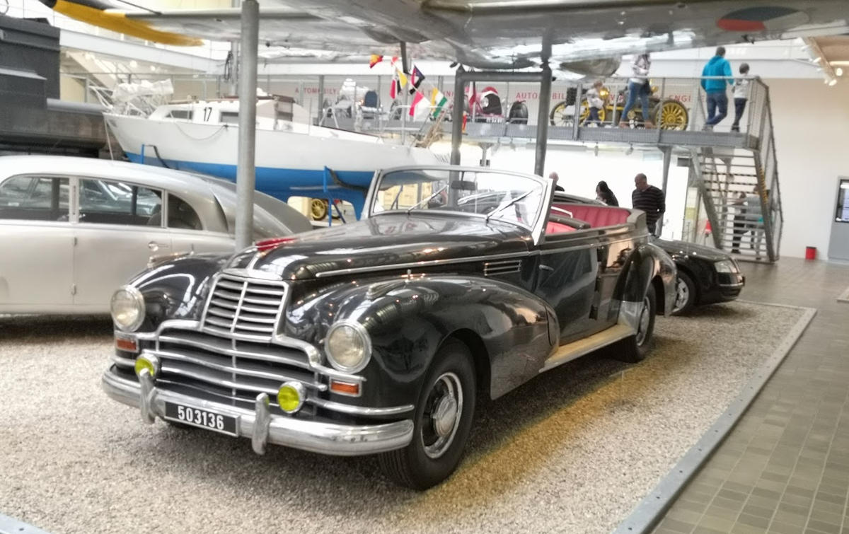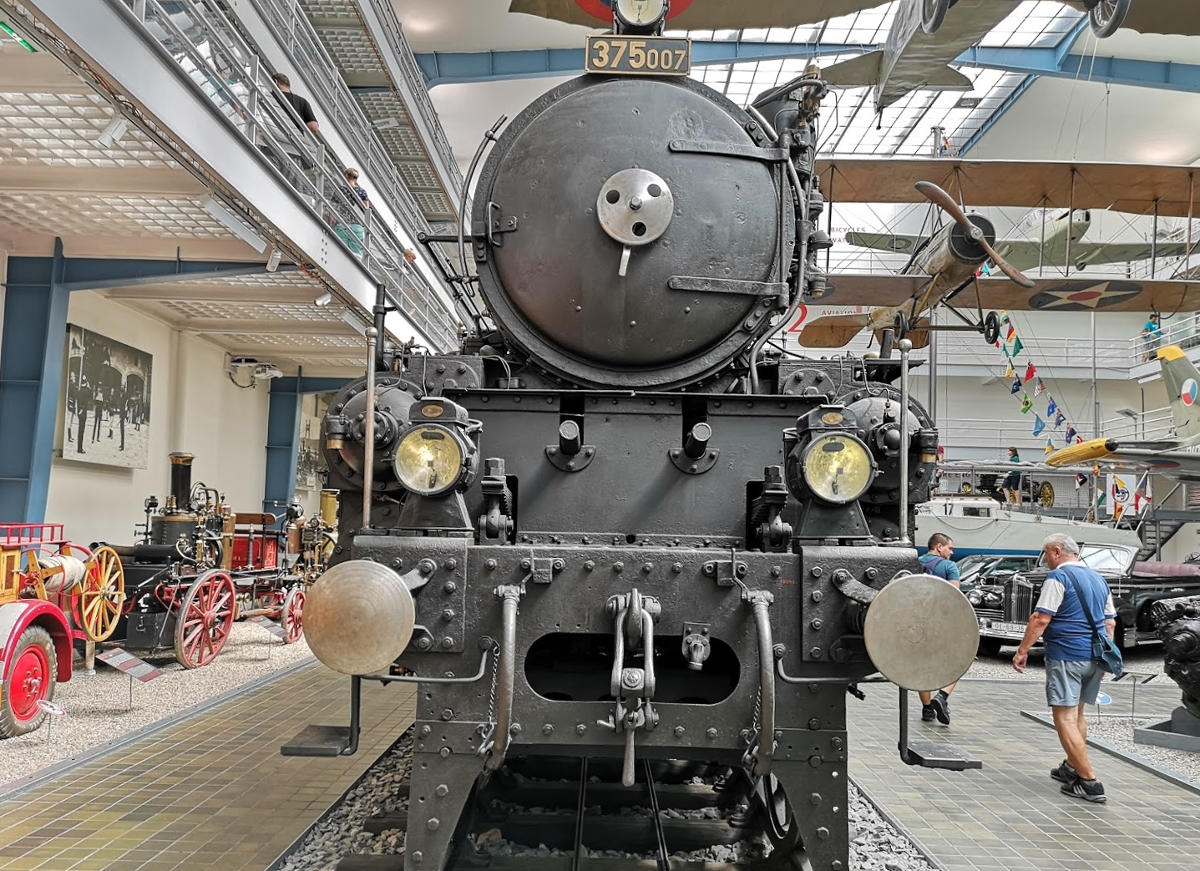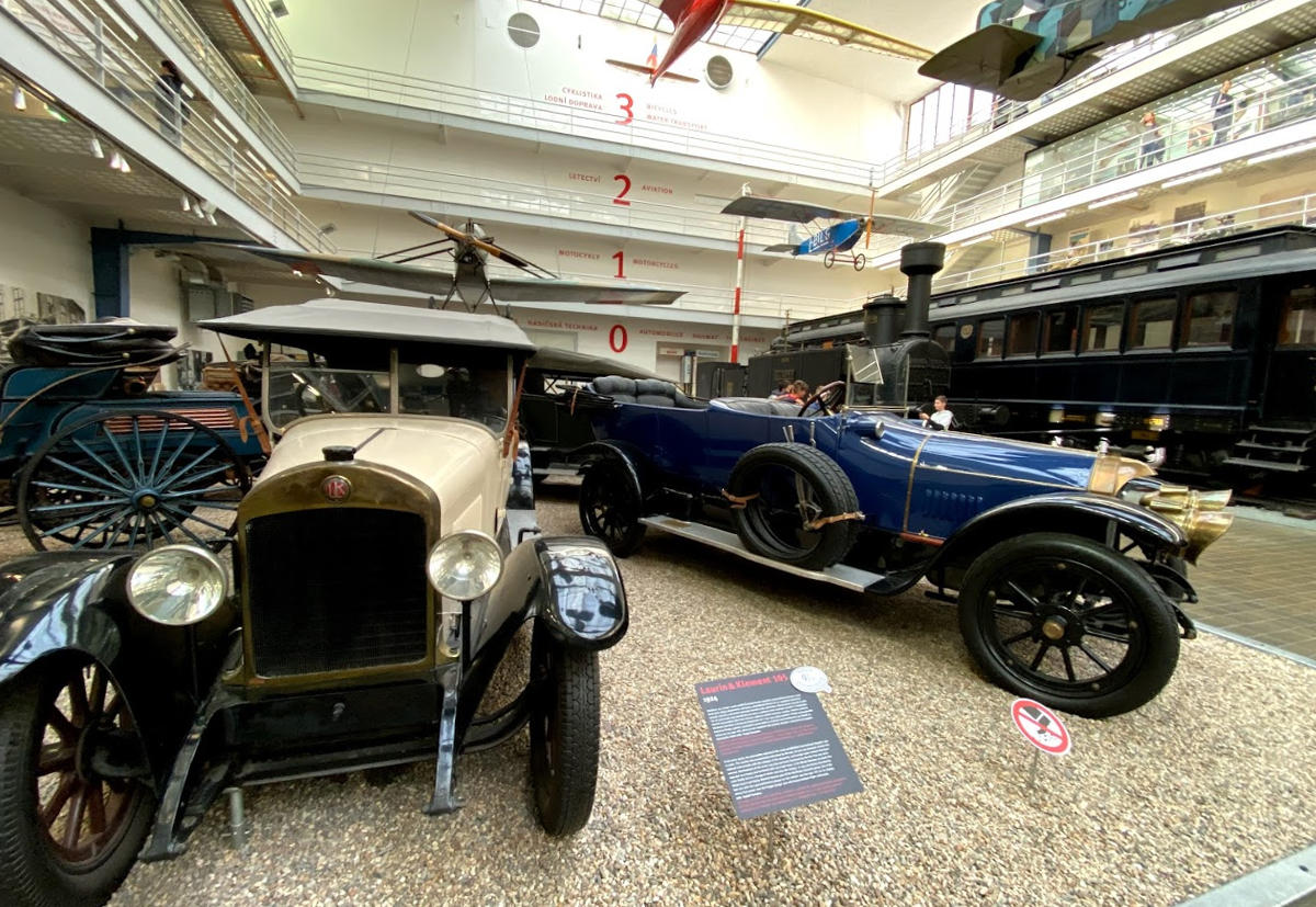 Центральний зал займають різні транспортні засоби, найбільші – два паровози. Уздовж однієї стіни вишикувалися знамениті чеські мотоцикли і велосипеди, навпроти красується шеренга ретро-автомобілів, в їх числі гоночні боліди, перші «Шкоди», «Татри» і «Мерседеси».
