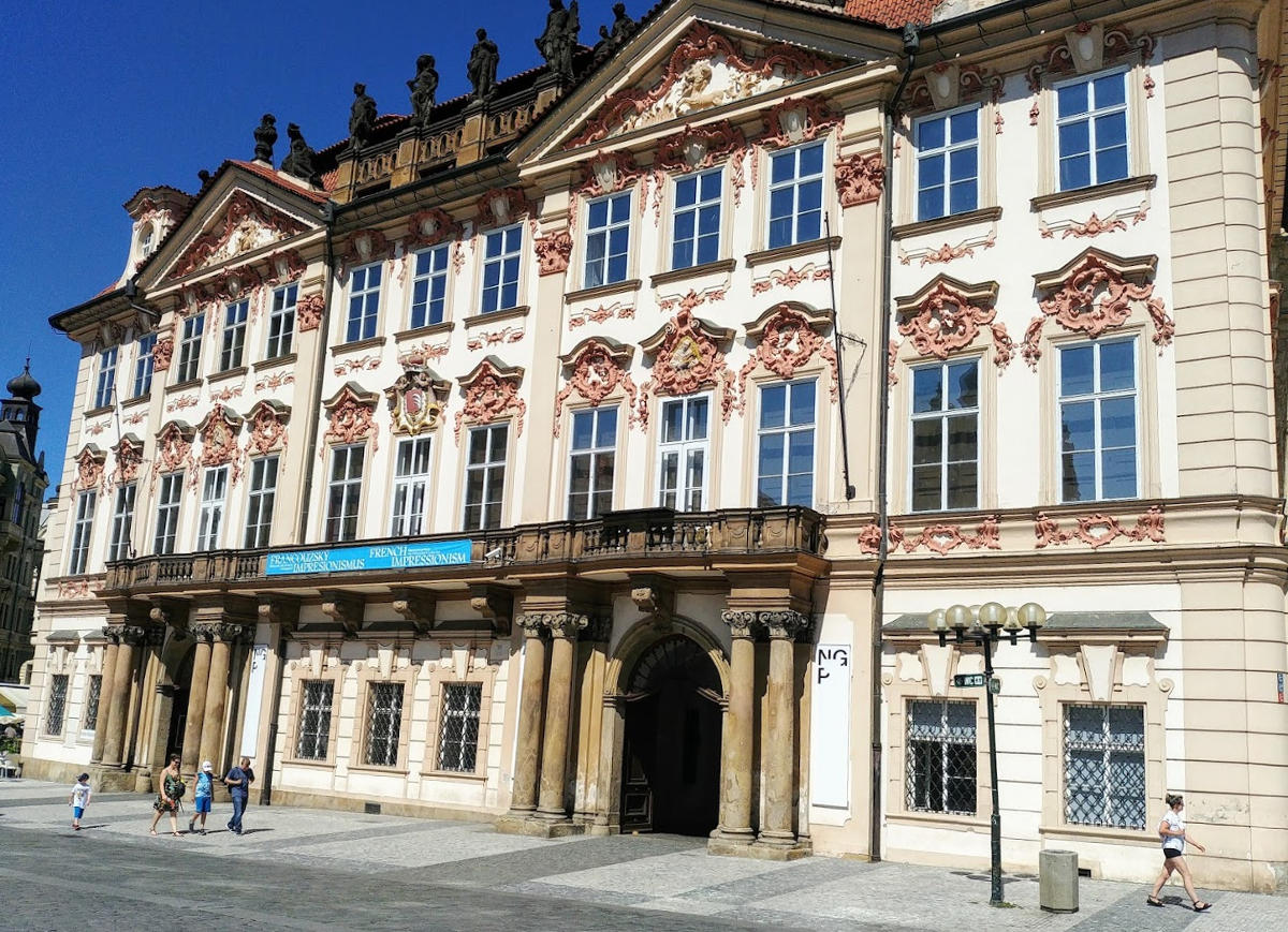 Чеська Національна галерея розподілена по кільком будівлям в центрі Праги. Одна з них – Палац Кінских на Староміській площі, де виставлено мистецтво Старого Світу, Азії, Стародавнього Середземномор’я і Близького Сходу. Гармонійний витончений фасад помітний відразу, він виступає на кілька метрів вперед за рівну лінію будинків. Кажуть, ніби замовник будівництва граф Ян Гольц дав великий хабар чиновникам, і вони дозволили цю вільність, за що і були повішені на площі після чергової інспекції. У 1768 р палац купив князь Священної Римської імперії Штепан Кінський, спадкоємці володіли ним до 1945 року, коли будівлю націоналізували.