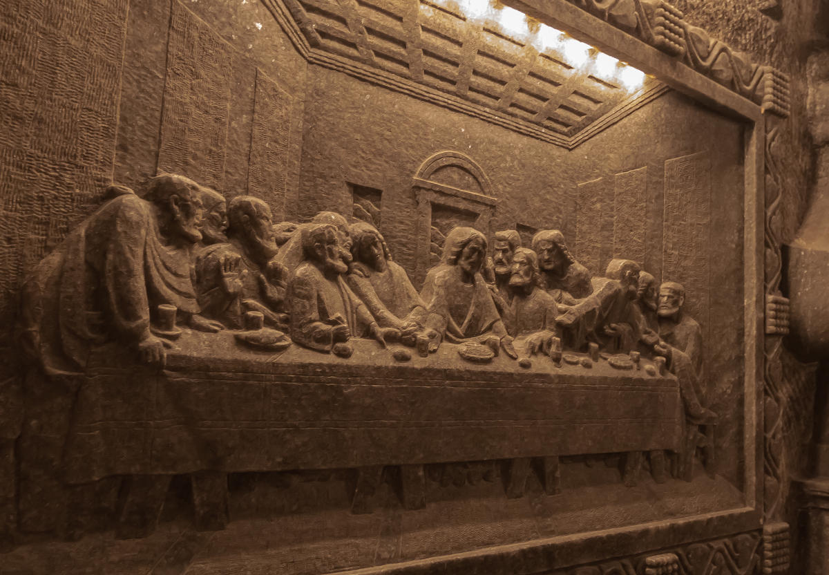 У каплиці все виконано з солі: рельєфні і скульптурні композиції, і навіть звисаючы зі стелі камери грандіозні люстри. Є тут і соляна копія «Таємної вечері».