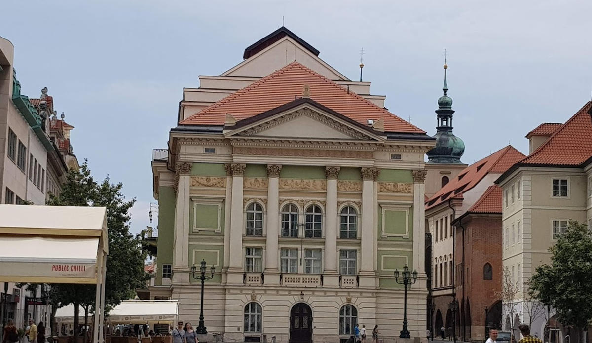 Проект був здійснений в 1783 р, коли театр відкрився для публіки п’єсою знаменитого німецького драматурга Лессінга «Емілія Галотти». На портику будівлі девіз – Patriae et Musis ( «Батьківщині і музам»). Розташована будівля на площі фруктового ринку в Старому місті Праги.