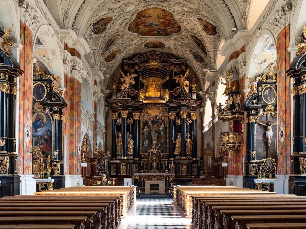 Втім, у церкві вдалося зберегти і давніші елементи декору, як, наприклад, готичне розп’яття 1510 року, створене з використанням натурального людського волосся. А біля входу до храму височить скульптура велетня Хаймона, що становить 5 метрів заввишки. Вона була споруджена в 1470 р. і зображує легендарного засновника Вільтенського монастиря, що вбив дракона, що охороняв золото на вершині гори Бергізель.